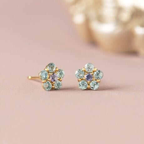 花の中心には優しく光を放つタンザナイト(12月誕生石)、周りには澄んだブルートパーズ(11月誕生石)をあしらい、立体感のあるパンジーの花をデザインしています。