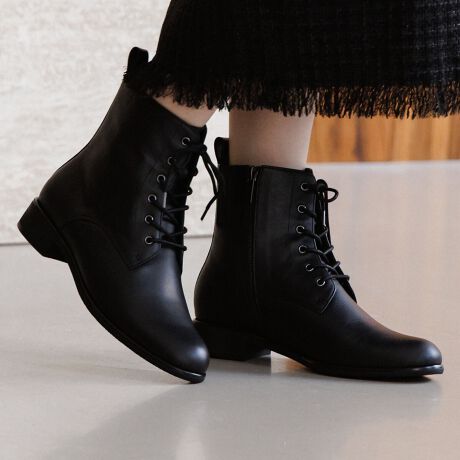 カジュアルに見えがちなレースアップブーツは、すっきりとしたラウンドトゥと筒周りのバランスできれいめな雰囲気を演出します。ソフトな撥水レザーを使用しているので足当たりも柔らかく履きやすいのがポイント。かかと部分のフィット感アップと衝撃吸収効果を兼ね備えたハーフタイプのインソールを搭載。ブラック、Dブラウンの2色展開で合わせるボトムスを選ばない万能ブーツです。
