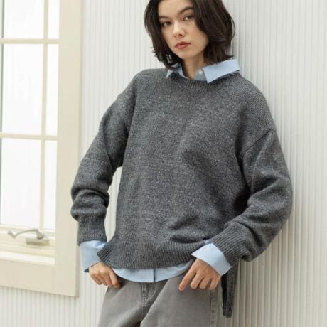 シンプルなクルーネックと、ゆったりシルエットがポイントのニットプルオーバー