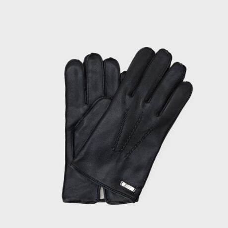シンプルでミニマムなデザインのロゴ入りプレートを付けたレザーグローブ。