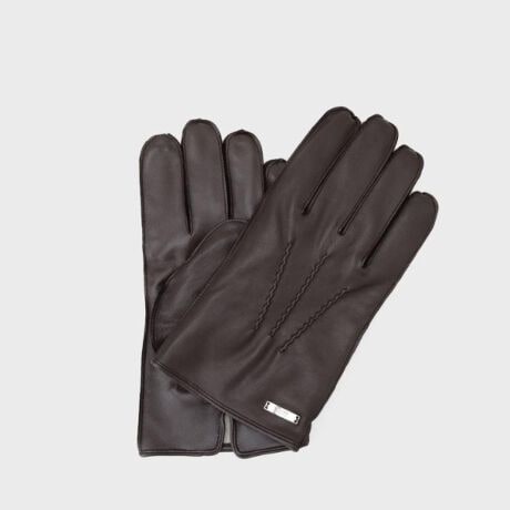 シンプルでミニマムなデザインのロゴ入りプレートを付けたレザーグローブ。