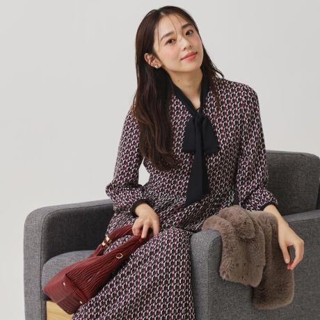 クードシャンスらしいオリジナルジオメトリック柄プリントのプリーツワンピースです。