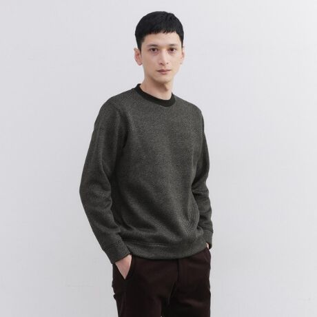 見た目にもあたたかいザックリとした太い糸を使ったセーターの様な表面に対し、裏面は起毛をかける事でフリースの保温性を合わせ持つハイブリッドなセーターフリースを使用したトレーナーです。