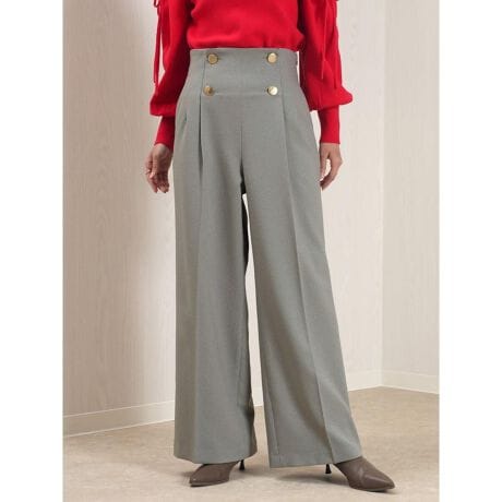 フロントのゴールドボタンがアクセントになったマリン型ワイドパンツ。