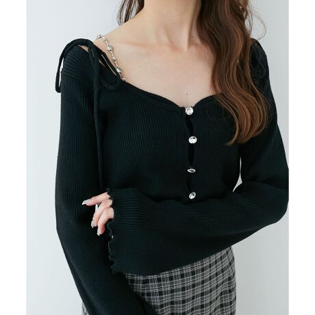 ビジューボタンが目を惹くカーディガンと、ビジューチェーンの肩紐がアクセントのキャミソールがセットになった、フェミニンムードたっぷりのアイテム。