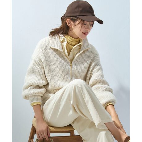表情豊かなファンシーヤーンを使用した、ジップアップニットブルゾンです。ふっくらとした畦編みで仕立てることで、程よいボリューム感と温かみのある表情を演出。顔周りをすっきりと見せるハイネックデザインは、首元まで暖かく過ごせてシーズンムードが高まります。裾側からも開閉できるファスナーもデザインのポイント。全て閉めてトップスとして着用したり、少し開けて抜け感を演出したり、羽織りとしてインナーを見せたりと、様々な着こなしをお楽しみいただけます。また、編みで表現されたパフスリーブが、女性らしい柔らかな印象をプラス。デニムやワイドパンツと合わせてカジュアルに、スラックスやスカートと合わせて上品になど幅広いシーンで活躍するアイテムです。スカーフやマフラーなどの小物をプラスすれば、より一層華やかなスタイリングが完成します。アウターのインナーとしても着やすい厚みで、ロングシーズンご着用いただけます。カラーは、顔周りを明るく見せる柔らかな印象のアイボリー(#002)、シックで洗練された雰囲気のグレー(#004)の2色展開です。