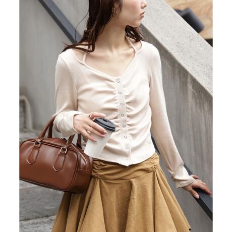 ギャザーが映えるデザイントップス。ウォーム感と伸縮性のある肌触りの良い天竺ジャージ素材を使用しており、体にフィットするサイズです。スナップ釦は裾から1つか2つ外して、ボトムスのウエストを見せる着こなしがおすすめ。襟は広めながらホルター紐で着やすくなっています。身頃とウエストの高い位置にギャザーが入り、スタイルアップを期待。ボリュームのあるバレルパンツや、膝丈のナロースカート×ローファーでY2Kスタイルもおすすめです。※モデルの着用画像の場合、光の当たり具合により、実際の色味と異なって見えることがございます。色味は、商品単体の画像をご参照ください。