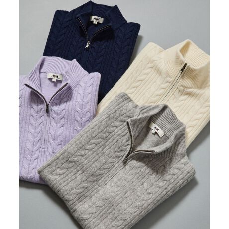 前身頃には7ゲージで編み上げた立体的なケーブル編みを施し、上品な表情を演出。袖と後身頃は12ゲージの天竺編みで薄手に仕上げることで、ジャケットやアウターを羽織っても着膨れせず、すっきりとスマートに着こなせるよう工夫しました。ハイネックのZIPデザインは、首元を暖かく保ちながら、着こなしに洗練された印象を与えます。