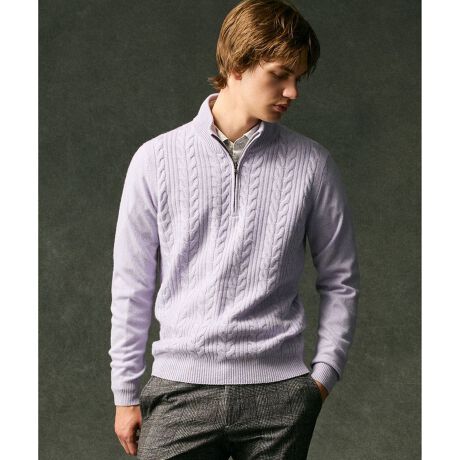 前身頃には7ゲージで編み上げた立体的なケーブル編みを施し、上品な表情を演出。袖と後身頃は12ゲージの天竺編みで薄手に仕上げることで、ジャケットやアウターを羽織っても着膨れせず、すっきりとスマートに着こなせるよう工夫しました。ハイネックのZIPデザインは、首元を暖かく保ちながら、着こなしに洗練された印象を与えます。