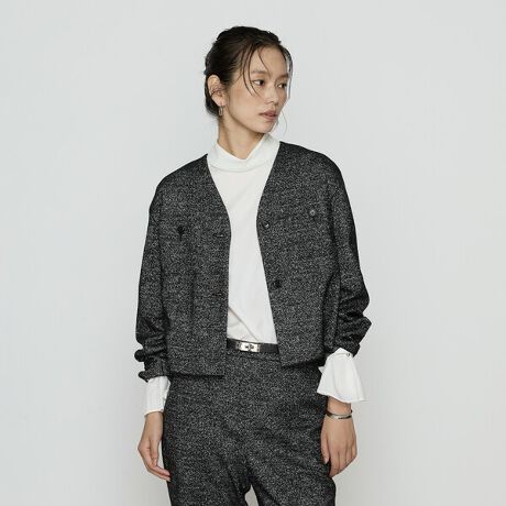 ツイードをジャージーで表現した素材で仕立てたジャージージャケットは、本格的なツイードのジャケットほど気負わずに軽くカーディガン感覚で羽織れ、一枚で存在感のあるアイテムです。