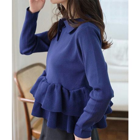 クラシカルなポロ襟と裾のフリルデザインが魅力のニットトップス。
