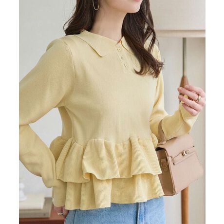 クラシカルなポロ襟と裾のフリルデザインが魅力のニットトップス。