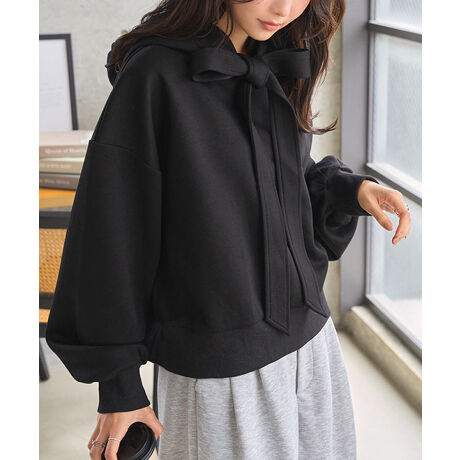 スウェットライクなカジュアルさに首元のビッグリボンが女性らしいデザイン性のあるアクセント。