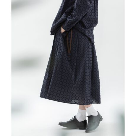ふんわりボリュームのタックスカート。サークル柄のスノーカットドビー生地で仕立てました。ウエストはゴム仕様で、紐先に付いた六角モチーフもさりげないポイントに。両サイドポケットつき。