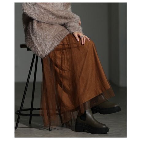 ふんわりチュールを重ねてフェミニンに、チュールを外してすっきり上品に。1枚で2通りの着こなしが楽しめる2WAYスカートです。ナロースカート部分は、くるぶしが隠れる長さで動くたびにしなやかに揺れ、伸縮性のあるスウェード調生地が優しくフィット。チュールは柔らかく、軽やかな透け感でレイヤードを楽しめます。