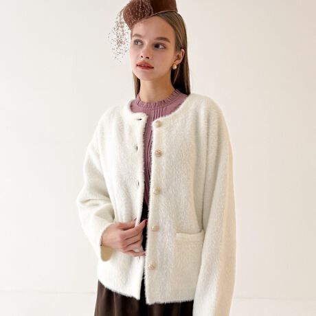 ふわふわとした柔らかなシャギー素材が、シーズンムードを演出してくれるニットカーディガン。