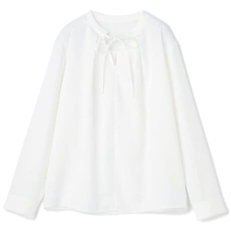 【長袖】洗えるキーネック リボンブラウス ホワイト