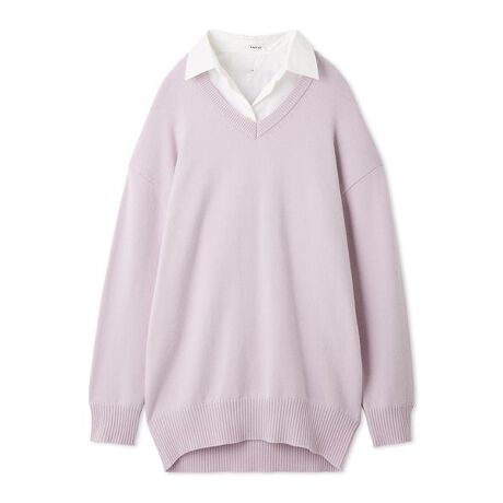 ニットワンピースに取り外し可能な付け襟をセットにした、重ね着風のデザインがトレンドライク。