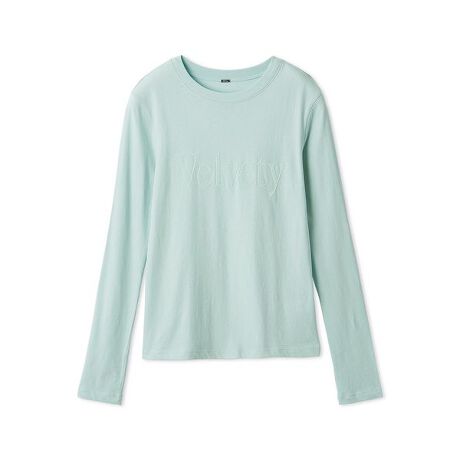 “なめらかで柔らかい”といった意味の「Velvety」という言葉を、ロゴタイポにしてプリント。ベロアライクな光沢が特長のフロッキープリント加工で、言葉の持つ優しい響きを表現しています。