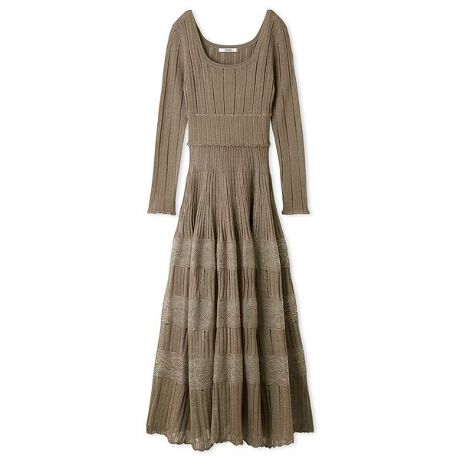 トップはボディラインにフィット、スカート部分は歩くたびにふわふわと揺れるシルエットで、1枚でメリハリをつけてお作りしたドラマティックなレースクロシェロングドレスが届きました。程よく透け感のある軽やかなニットで、すっきりと着られるのが特徴です。太幅のウエスト切り替えで着痩せ効果も抜群。スカート部分はエレガントなレースの模様を挟んで立体感を出し、今季らしいロマンティックな仕上がりに。深めに開いたネックラインがデコルテを美しく見せ、女性らしさと抜け感を両立します。透け感がありますが、ロングインナーキャミワンピ付きなので安心。オケージョンシーンからデイリーまで幅広く対応できる一枚です。