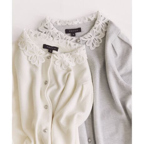 TOCCAオリジナルのエンブロイダリーレースを贅沢にあしらった、上品な表情のカーディガン。まるで繊細なレースブラウスをレイヤードしているかのようなデザインで、1枚で着映えする華やかさとエレガンスを兼ね備えたアイテム。前をすべて留めてプルオーバーのように着用すれば、きちんと感のあるトップスとして、スカートやパンツと合わせたスタイリングにぴったり。オフィスやきちんとしたシーンにも対応できる上品さを持ちつつ、羽織りとしても使える着回し力の高い一着です。
