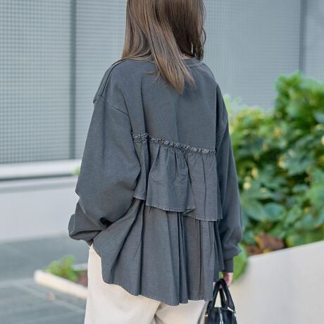 後ろに広がるアシンメトリーフリルが印象的なフリルドッキングピグメント裏毛スウェット。