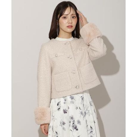 キュートな素材感とエレガントなディテールが叶える上品コーデ【Design】・くるくるとしたブークレ生地を使用したノーカラーコート。・ハイウエストのボトムスと相性抜群なショート丈のアイテムです。・パールボタンと袖ファーで華やかな仕上がり♪・ハイネックニットやリボンタイブラウスなど、ボリュームのあるトップスと着回しコーデがおすすめ◎・袖ファーは取り外し可能なので、気分に合わせてアレンジいただけます!・ポケット付き。【Fabric】・独特な質感が魅力のブークレ生地を使用。・裏地付きなので着脱ぎもスムーズ。・ホワイト、ピンクベージュ、ブラックの3色展開になります。【Care】・ドライクリーニング