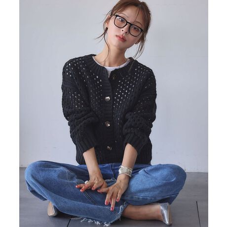 【2025AW】透かし編み メッシュニット クルーネック カーディガン