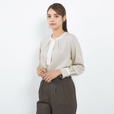 【長袖】洗えるバイカラーボウタイプルオーバー ブラウス ベージュ ストレッチ UV加工 静電気防止