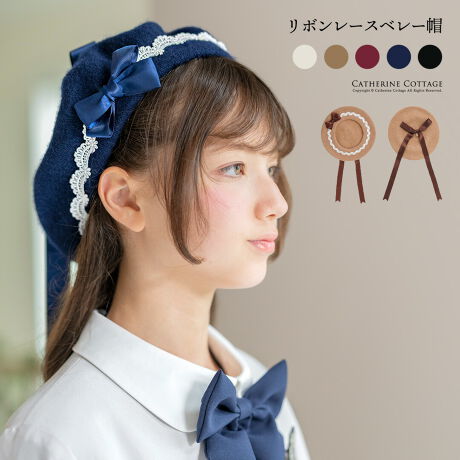 レースとリボンをあしらった、大人可愛いベレー帽です。