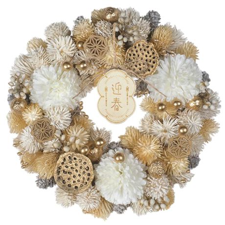 【迎春にふさわしい彩り♪】天然素材のぬくもりで新年を迎える準備にぴったりな「ジャパネスクリース M」が登場。【ナチュラルな存在感】木の実や花など、こだわりの天然素材を贅沢に使用した、落ち着いた華やかさが魅力のリース。【季節を問わない優しさ】水やり不要でお手入れいらず。暮らしに寄り添うインテリアとして楽しめる優雅な佇まい。【玄関にも映える上品さ】和洋問わずどんな空間にも自然と馴染み、玄関やリビングにやさしく華を添えるナチュラルカラー。【贈り物にもおすすめ】木製のメッセージタグがさりげないアクセントに。専用BOX入りで、大人世代のギフトにも最適。