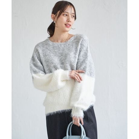素材とカラーのブロッキングを楽しむ、ゆるシルエットのニットプルオーバーです。