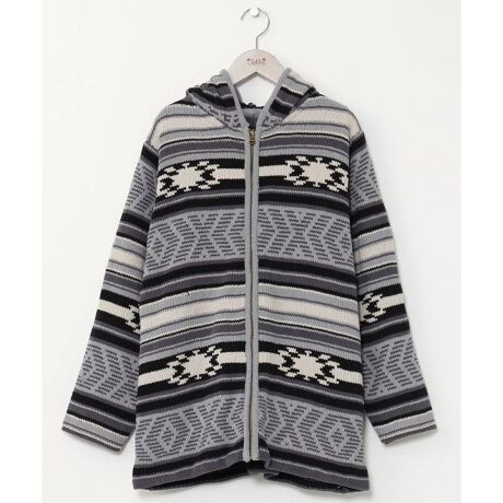 [型番:49T-5307-2025]柔らかく厚みのあるニットアウター。ハワイの海を感じるさわやかなカラーのオルテガ柄。この一枚でコーディネートが決まります。たっぷりと空気を含んだモール素材で着心地は軽く暖かいアウターです。
