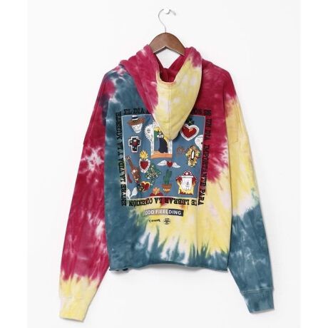 [型番:JSU-5305-2025]【Amina×grn】しっかりとした裏毛素材の、目を惹くタイダイ染めが印象的なフードトップス。裾は古着感あふれるカットオフ仕様で、カジュアルに日常で大活躍。背面にはメキシコの「死者の日」のモチーフをプリント。スペイン語で「死者の日とは、生と死の繋がりを祝う重要な日」と書かれています。抗菌・防臭加工