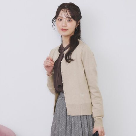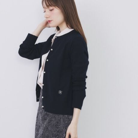 ビジュー釦にさり気ないバイカラーと刺繍がポイントのクルーネックカーディガン