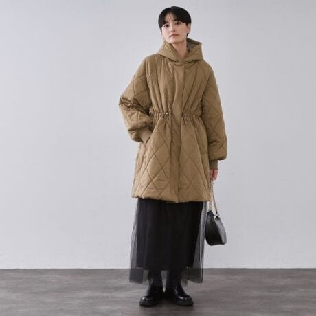 ・ダイヤ柄中綿キルティングのフードロングコート。