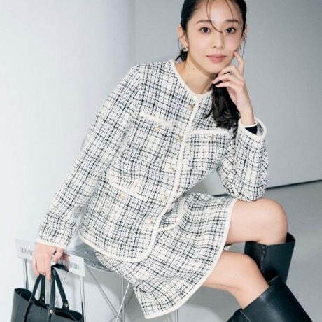・さりげないミニスパンコールと、カラーを効かせたチェックツイードがクラシカルでありながらモダンな印象を演出。