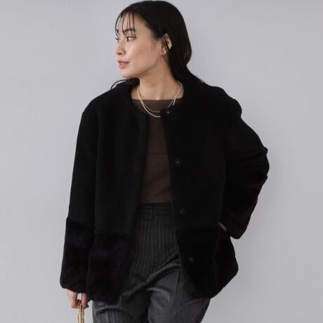 毛足の異なるフェイクボアをドッキングした、華やかなショートコート