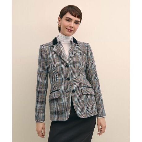 軽やかでぬくもりのある質感と独特の風合いで知られるシェットランドウールを使用。レッドやブルーなどアクセントカラーを織り込んだクラシックなチェック柄を主役に、上襟とポケットにあしらわれたベルベット、本革のホースエンブレムボタンなど、当時の乗馬ジャケットによく見られるディテールを加えました。クラシックスタイルの普遍的な魅力を宿した一着です。