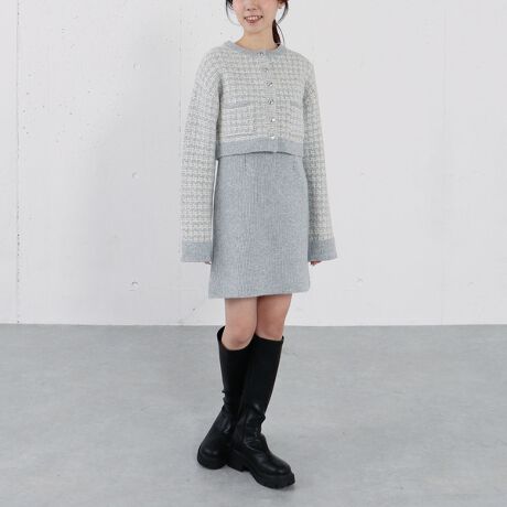 ツイードニットカーディガンとミニキャミニットワンピースのセットアイテム。