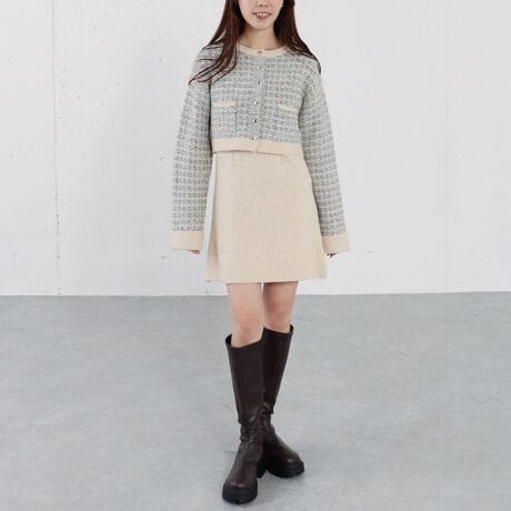 ツイードニットカーディガンとミニキャミニットワンピースのセットアイテム。
