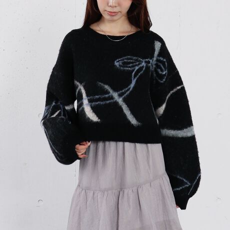 リボン柄をジャガードで編み上げた、上品な可愛さが魅力のショートニット。