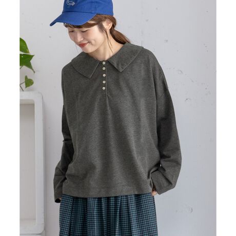 フラットカラーできちんと感がありながら、肩を落としたボックスシルエットでリラックスして着られるトップス。並んだボタンがポイントで、開けて抜け感のある着こなしをするのもおすすめです。スウェットとTシャツを良いとこ取りしたような程よい厚みのミニ裏毛生地で、さらっと着ていただけるアイテムです。ハイネックやタートルネックインナーを下に合わせる着こなしも可愛いです。