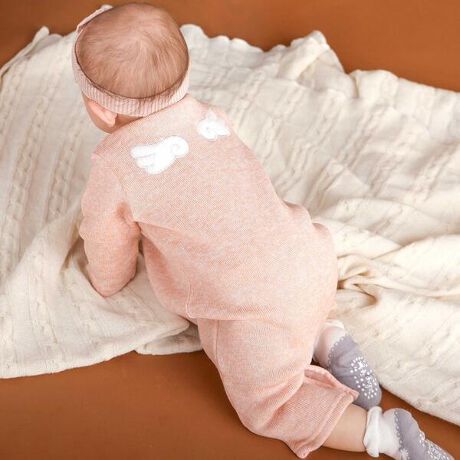 カラーはどちらもベビーらしい優しい雰囲気を演出するグレーがかった杢オフホワイトと杢ピンクの2色展開。