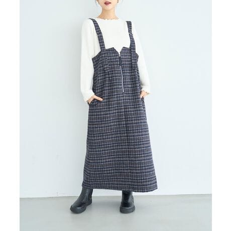 秋冬コーデの主役にしたいチェック柄ジャンスカ。高めのウエスト位置が一枚で今年らしいトレンド感を演出。