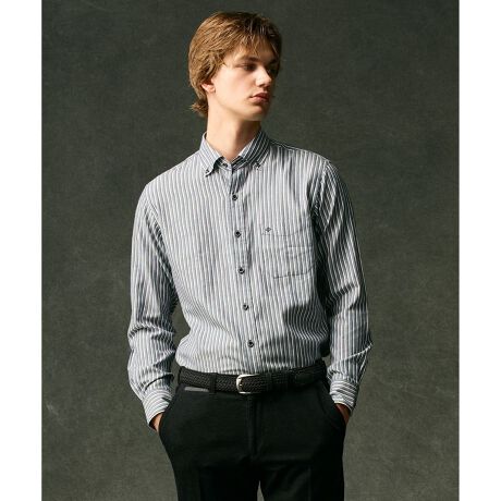 柄の異なるストライプを組み合わせ、織り柄による立体感と配色のコントラストを際立たせたデザインが特徴です。衿元はボタンダウンカラーを採用し、カチッとしすぎない上品な印象に仕上げました。さらに製品洗いを施すことで、買ったその日から身体に馴染むような、こなれた自然な風合いを実現しています。一枚着としてはもちろん、ジャケットやニットのインナーとしてもコーディネートの主役となる、存在感のあるシャツです。