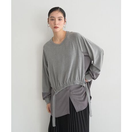 微起毛の短丈トップスとサテンシャツをレイヤードしたような旬テイストなプルオーバー。