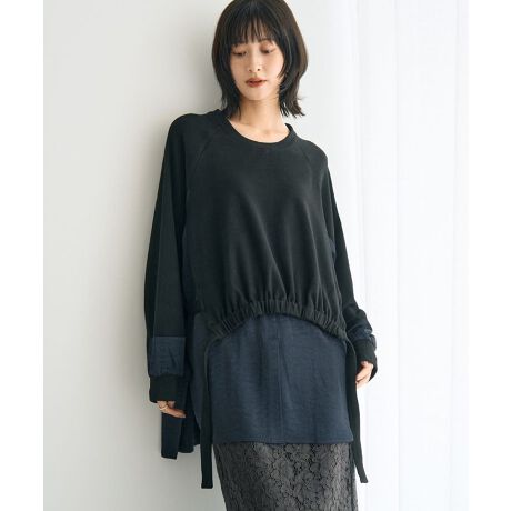 微起毛の短丈トップスとサテンシャツをレイヤードしたような旬テイストなプルオーバー。