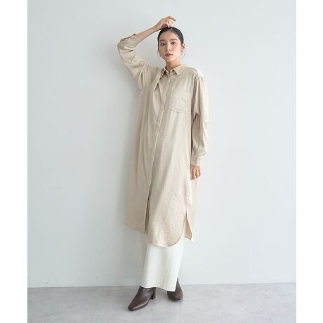 ヴィンテージライクな程よい厚地のサテン生地がこなれ感のある雰囲気のシャツワンピース。