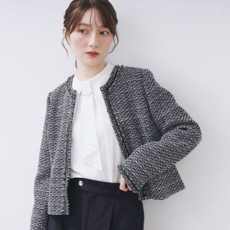 ・表情の異なる糸をミックスしたツイード素材による立体感が、上品さと控えめなトレンド感を両立しています。